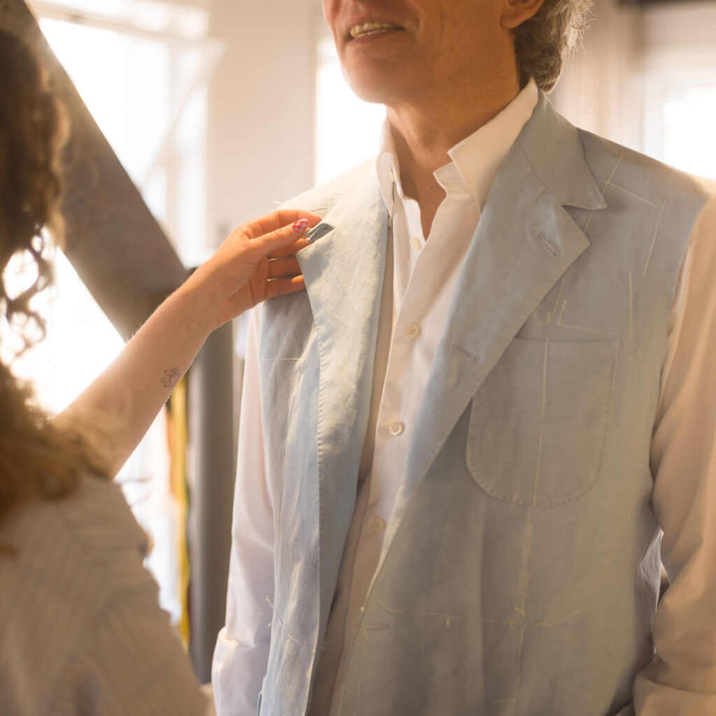 De maakwijze en de stof zijn de belangrijkste elementen voor de prijs van een kledingstuk; op enkele opties als ongevoerd bijvoorbeeld na. Als we veel met de hand doen, voor extra souplesse of duurdere stoffen gaan gebruiken maakt dat de uiteindelijke prijs hoger. Logisch toch? Onze pakken die we laten maken in India kosten meestal zo’n € 1600, in Italië zo’n € 2400 en gemaakt in eigen atelier in Utrecht gemiddeld € 2800.