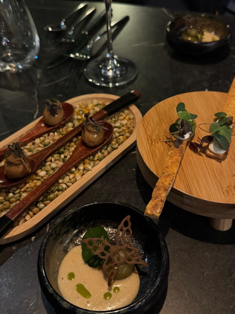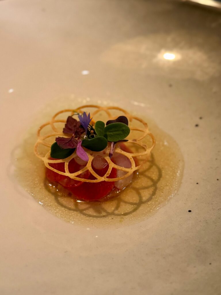De kaart is niet heel uitgebreid maar toch blijft kiezen heel moeilijk. Uiteraard krijg je hier ook enkele amuses. Wij kregen er drie. Een cracker gemaakt van komijn met daarop een crème van oude Oudegracht Utregse kaas, een beurre blanc van oester en paling met een crème van algen en pastinaak en een lepeltje met een stoof van het konijn en een gel van gefermenteerde knoflook. De drie amuses vormden dit keer ons voorgerecht. Lekker. Als hoofdgerecht kozen we Kingfish uit Zeeland – gemarineerd in saté specerijen met zoetzure radijs met een saus van dashi en bonito en een olie van bieslook.
