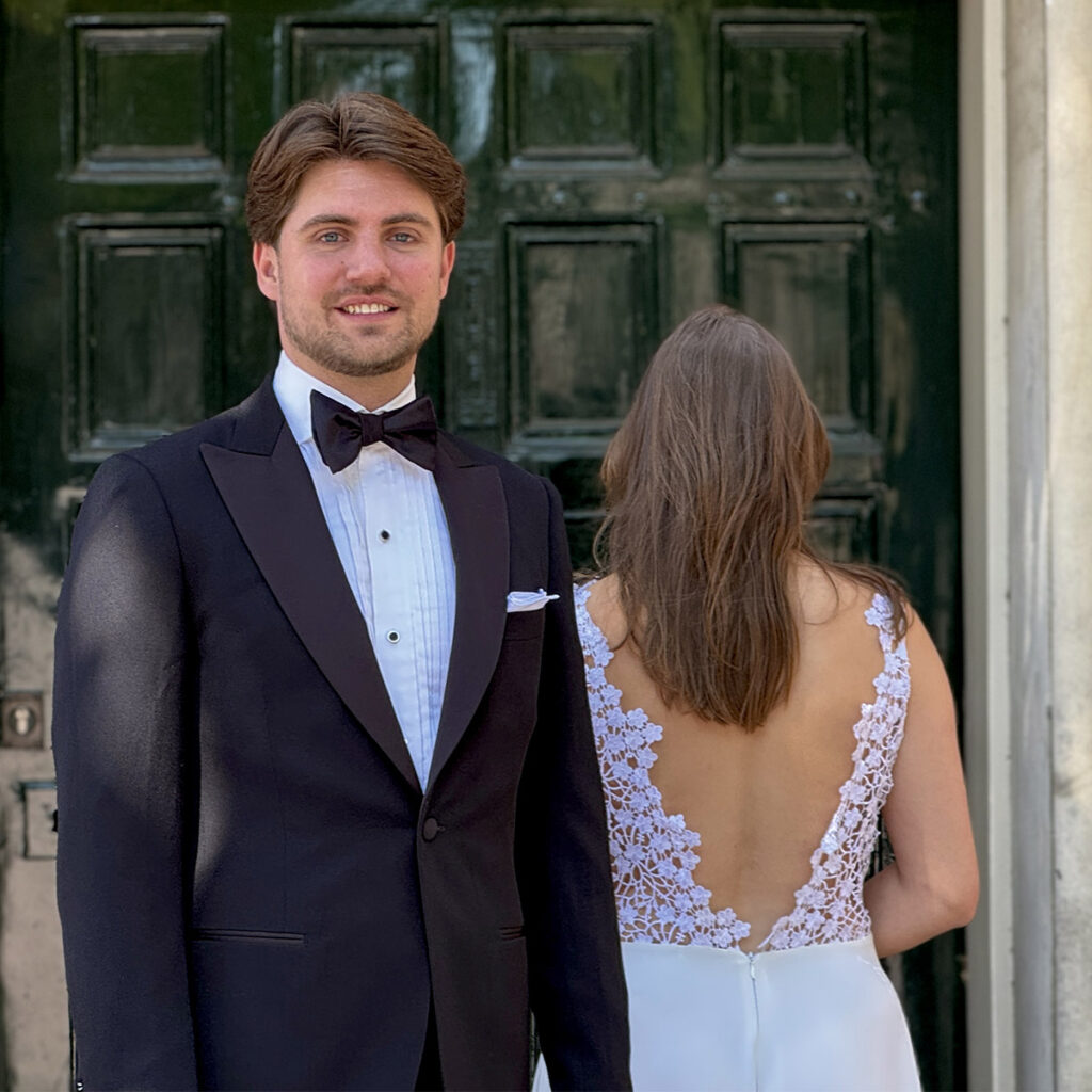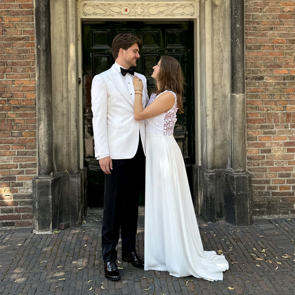 Er zijn een aantal opties. De saaiste kan, maar geven we hier niet veel aandacht. Gewoon een volledig polin hemd met een blinde sluiting. Nee ga dan voor een geplisseerd front van die zelfde polin stof maar met allemaal geplisseerde (gevouwen) laagjes tof. Dat geeft body en maakt het al een bijzonder hemd. Formeler nog en wat ons betreft nog iets chiquer is het hemd met een bib zoals we dat noemen, oftewel een voorkant in het hemd van een Marcelle pique stof. Een rijke wafelstrcutuur en van een iets opdikkende stof die je suit met studs. Fraaie losse knopen ingelegd met een onyx steen.
