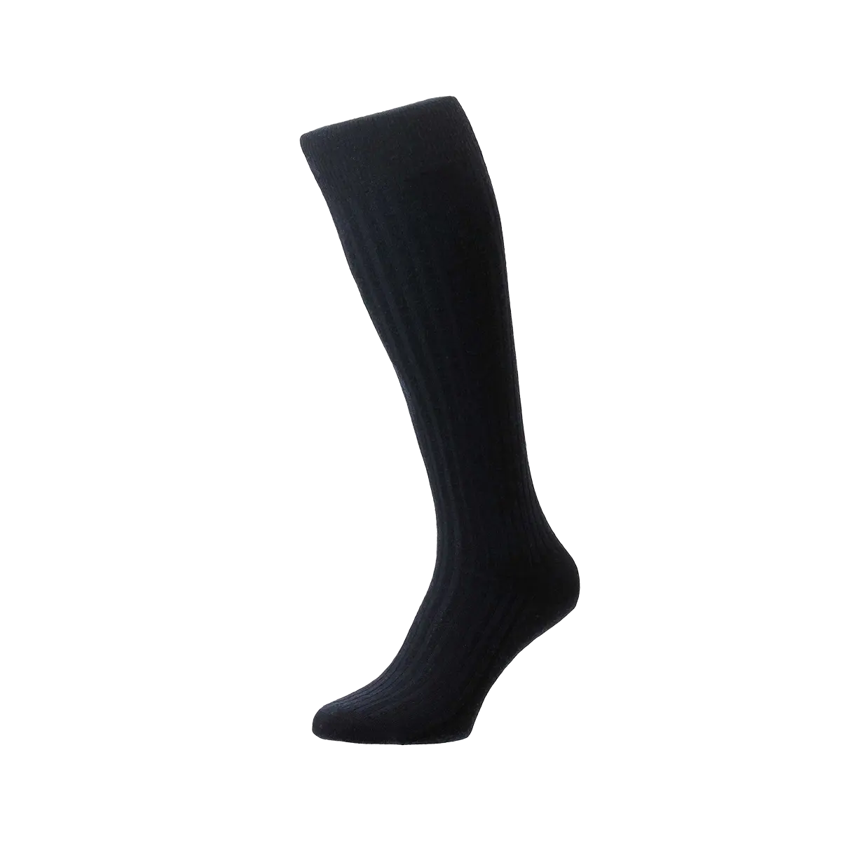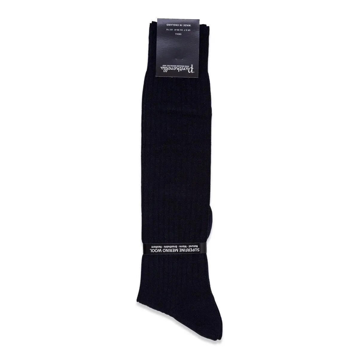 Lange blauwe kousen van Pantherella, 70% Merino wol, 30% nylon. Handgekettelde naad. Gemaakt in Engeland.