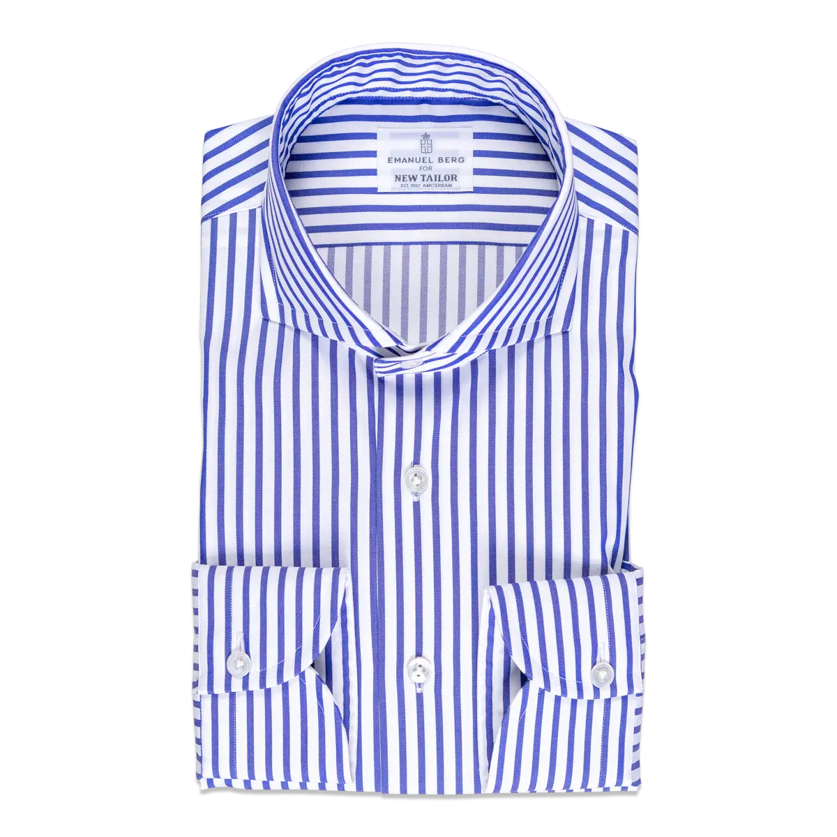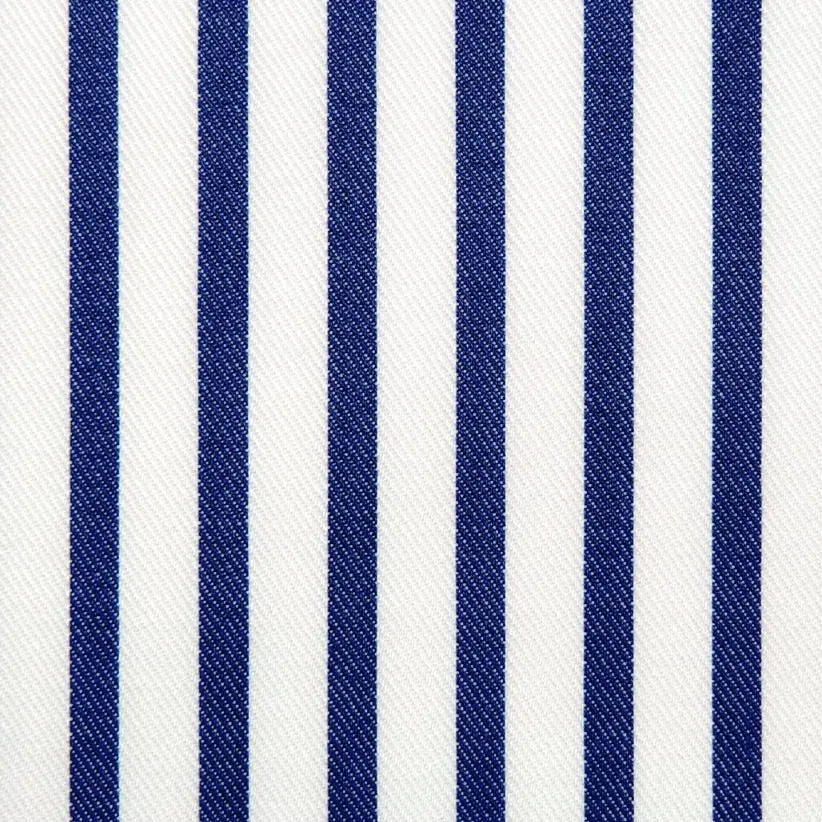 Mooie dikke streep in een twill en daarmee geschikt voor onder een pak, jasje en eventueel jouw trui. Mooi blauwe streep en niet doorschijnend doek. Hoeft niet per se gestreken te worden na de was. Gerust in je (over)hemd staan dus. Wij houden ervan omdat het net meer kleur heeft dan echt lichtblauw. Hier uitgevoerd met een NEW YORK kraag en enkele manchet.