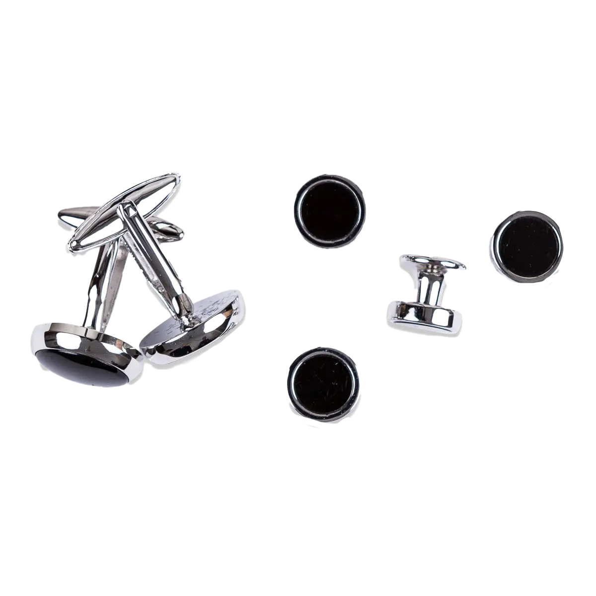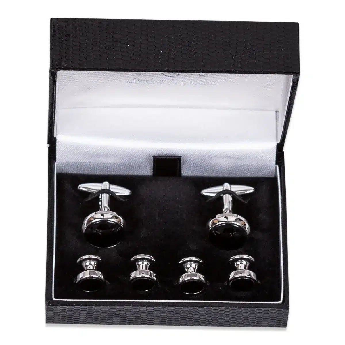 Zilverkleurige manchetknopen en vier studs ingelegd met onyx. Perfecte set voor de smoking.